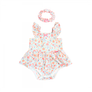 BeBe Infant Girl Romper – Floral Pattern Sleeveless Romper w. Hairband (Peach)