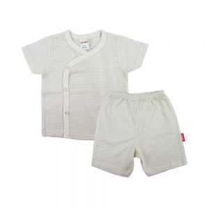 Infant Short Sleeve Front Opening Eyelet Tee With Short Pants – Beige With Brown And Green stripe
